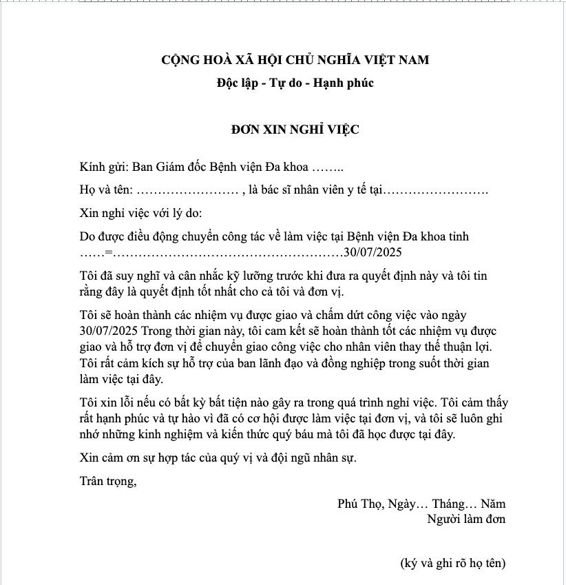 Mẫu đơn vì vấn đề sức khỏe minh họa trường hợp bác sĩ Lê Văn Thành cần thời gian điều trị theo kết luận của Hội đồng y khoa. Đây là quyết định dũng cảm và đúng đắn khi ưu tiên sức khỏe bản thân.